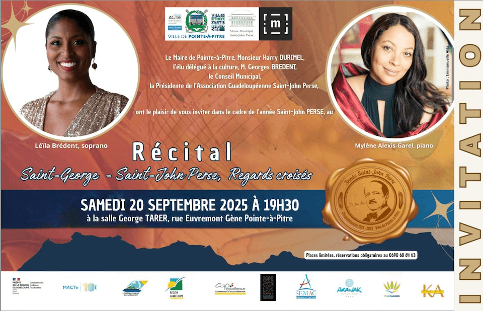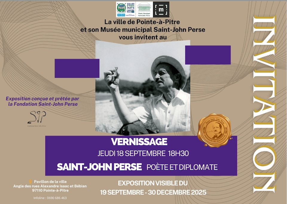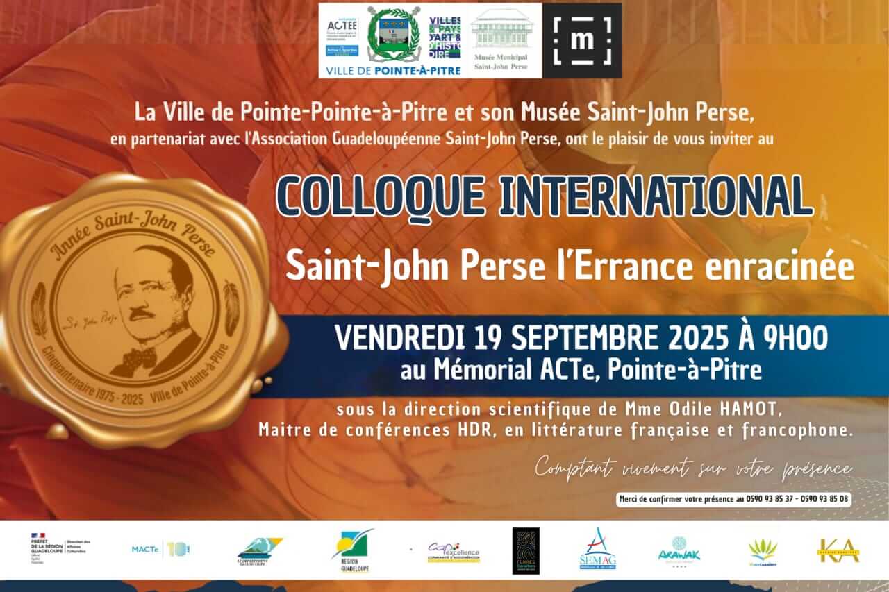 La ville de Pointe-à-Pitre et son Musée municipal Saint-John Perse, en partenariat avec l'Association Guadeloupéenne Saint-John Perse, ont le plaisir de vous inviter au Colloque International "Saint-John Perse l'Errance enracinée, le vendredi 19 septembre 2025 à 9h00 au Mémorial ACTe, Pointe-à-Pitre.